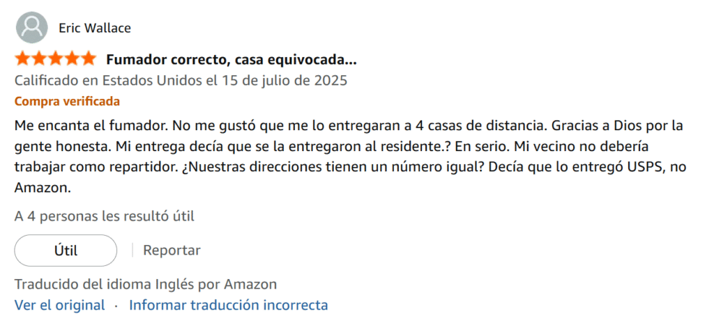 Me encanta el fumador. No me gustó que me lo entregaran a 4 casas de distancia. Gracias a Dios por la gente honesta. Mi entrega decía que se la entregaron al residente.? En serio. Mi vecino no debería trabajar como repartidor. ¿Nuestras direcciones tienen un número igual? Decía que lo entregó USPS, no Amazon.